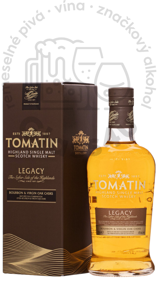 Škótska Single Malt whisky Tomatin Legacy zrie v panenských dubových sudoch a v ex-bourbon sudoch. Vďaka tomu že sa vyrába v oblasti Highland, je z vysoko kvalitného obilia a čistej pramenitej vody, čo zaručí že vo svojom pohári ochutnáte skvelú, nefalšovanú chuť whisky.